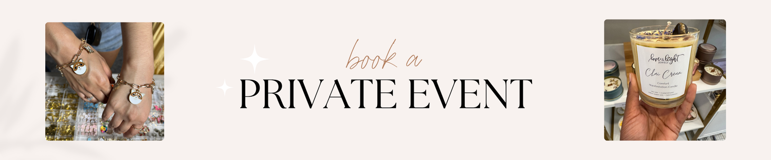 Looking to host a unique, hands-on experience or invite Love & Light Jewels to your next event? Whether it’s a Birthday Party, Bridal Shower, Sip & Shop or an interactive Make & Take Workshop—from charm jewelry and gemstone beaded bracelets to candle making, sun catcher crafting, or vision board creation—we’d love to bring creativity, connection, fun and beauty to your upcoming gathering.