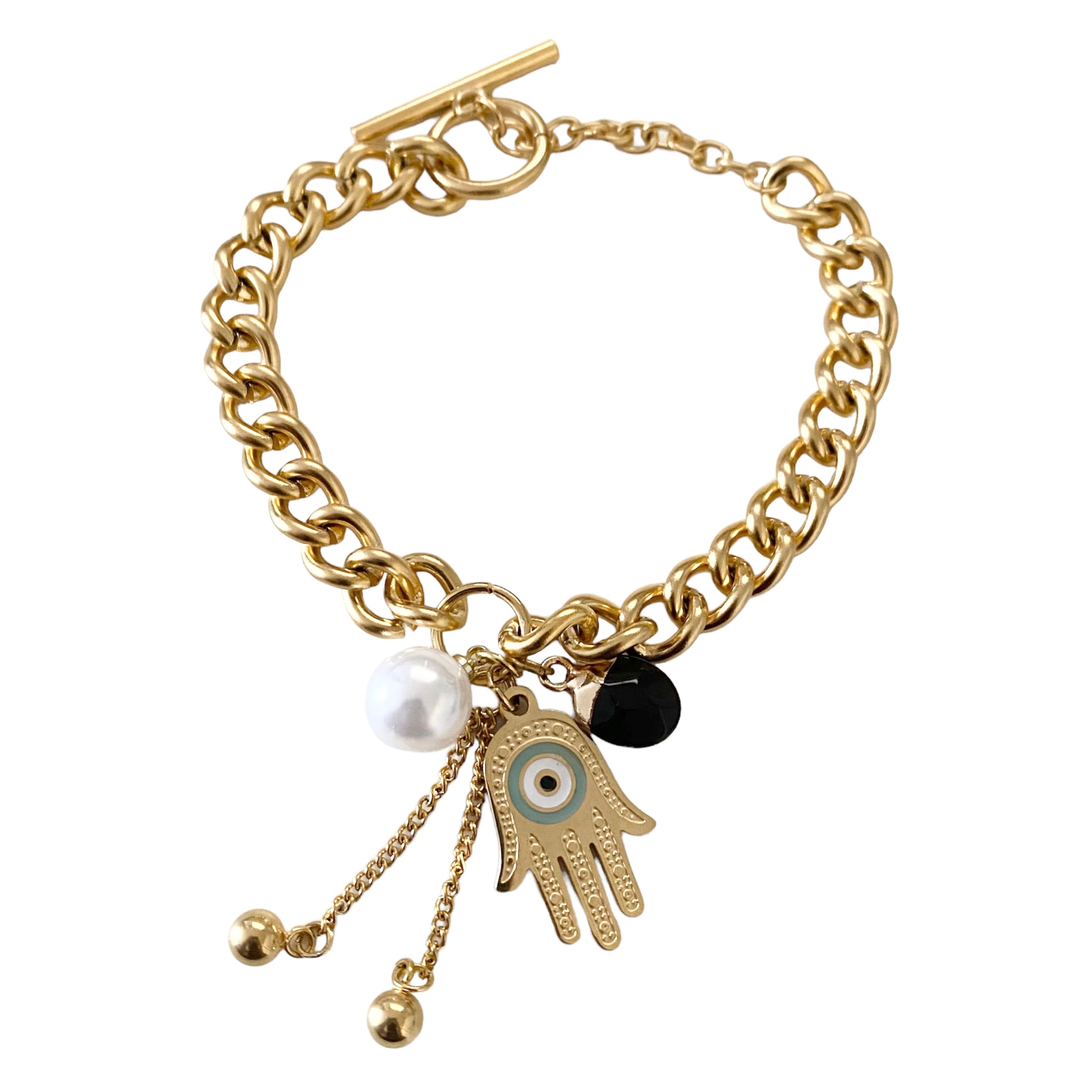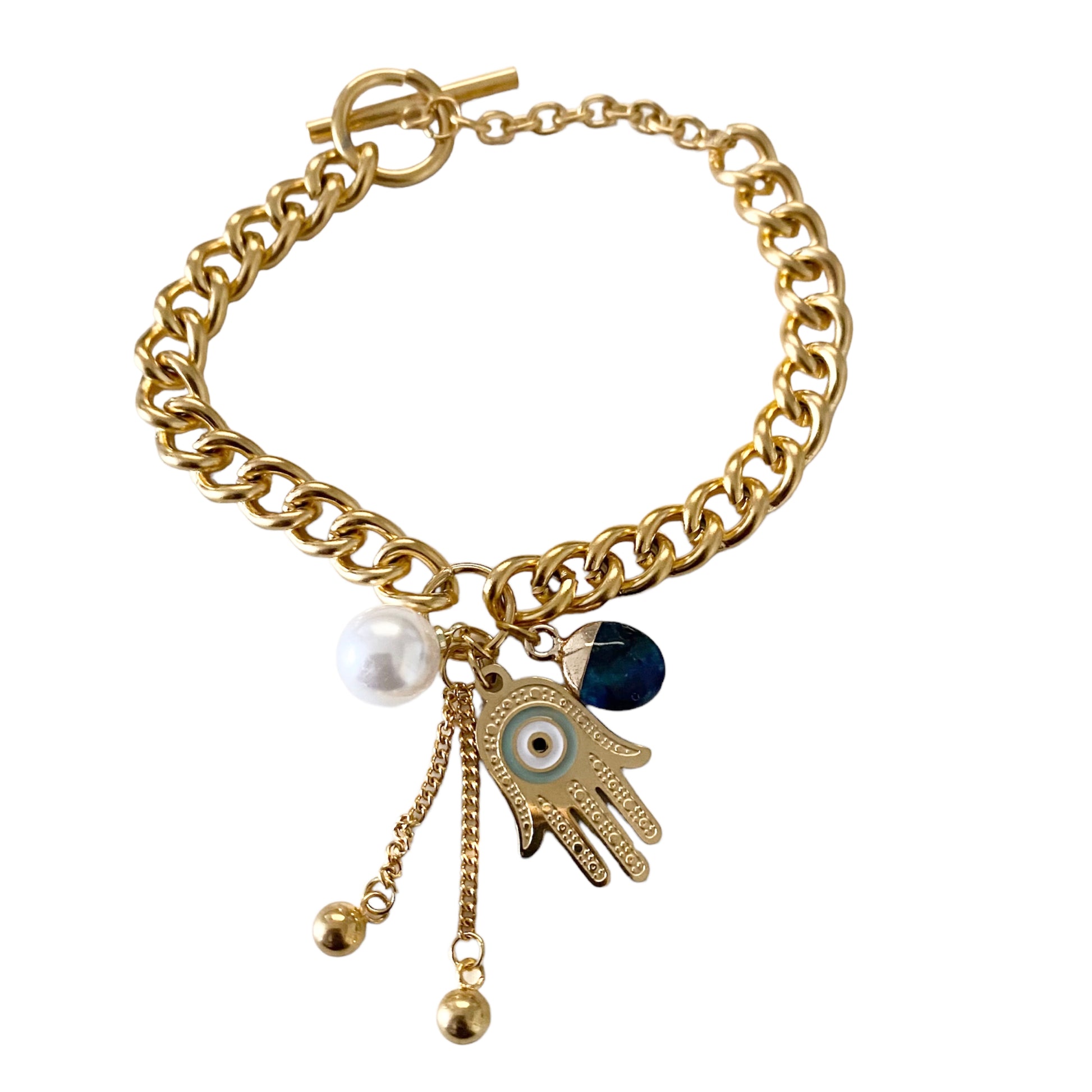 A gorgeous, stainless steel link bracelet adorned with 3 charms that help protect you from any bad vibes lurking around.
