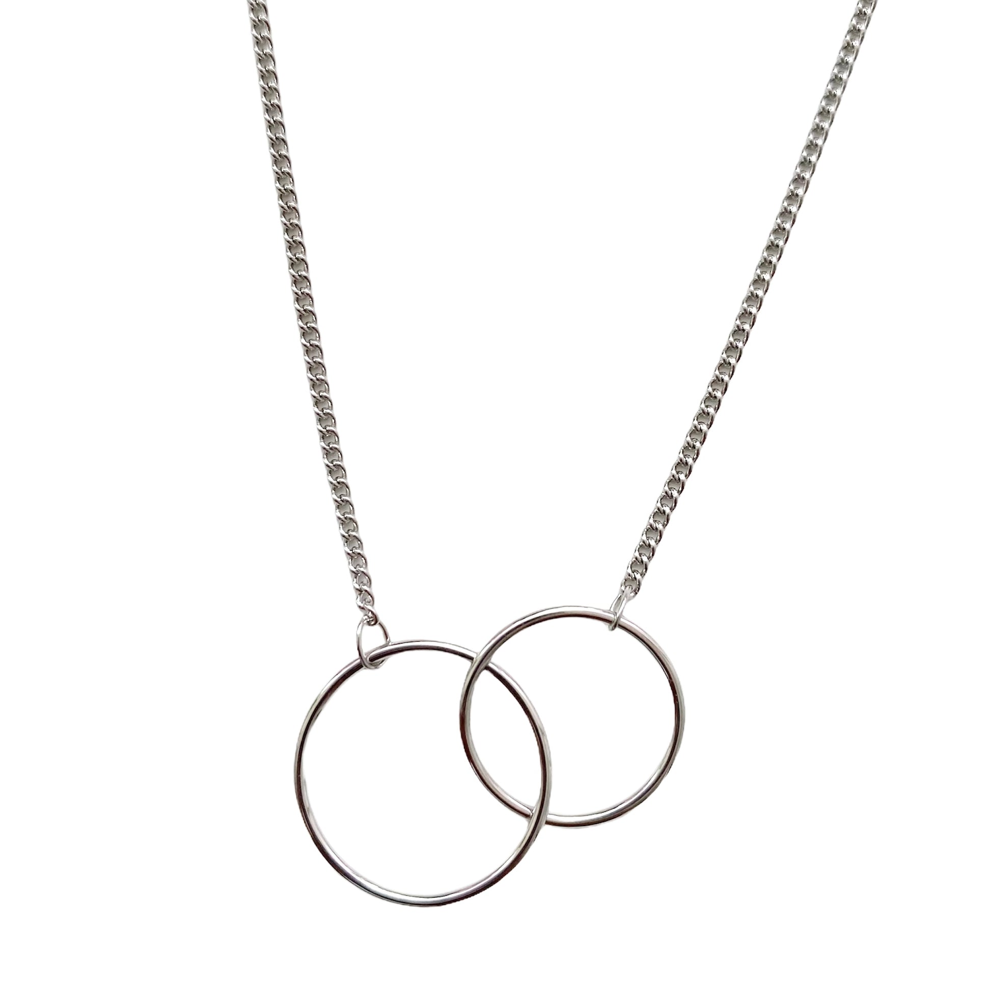 A sophisticated, sterling silver necklace with interlocking infinity circles as a pendant. Sits perfectly on the collar bone. A delicate look that compliments any outfit. Great for daily wear.