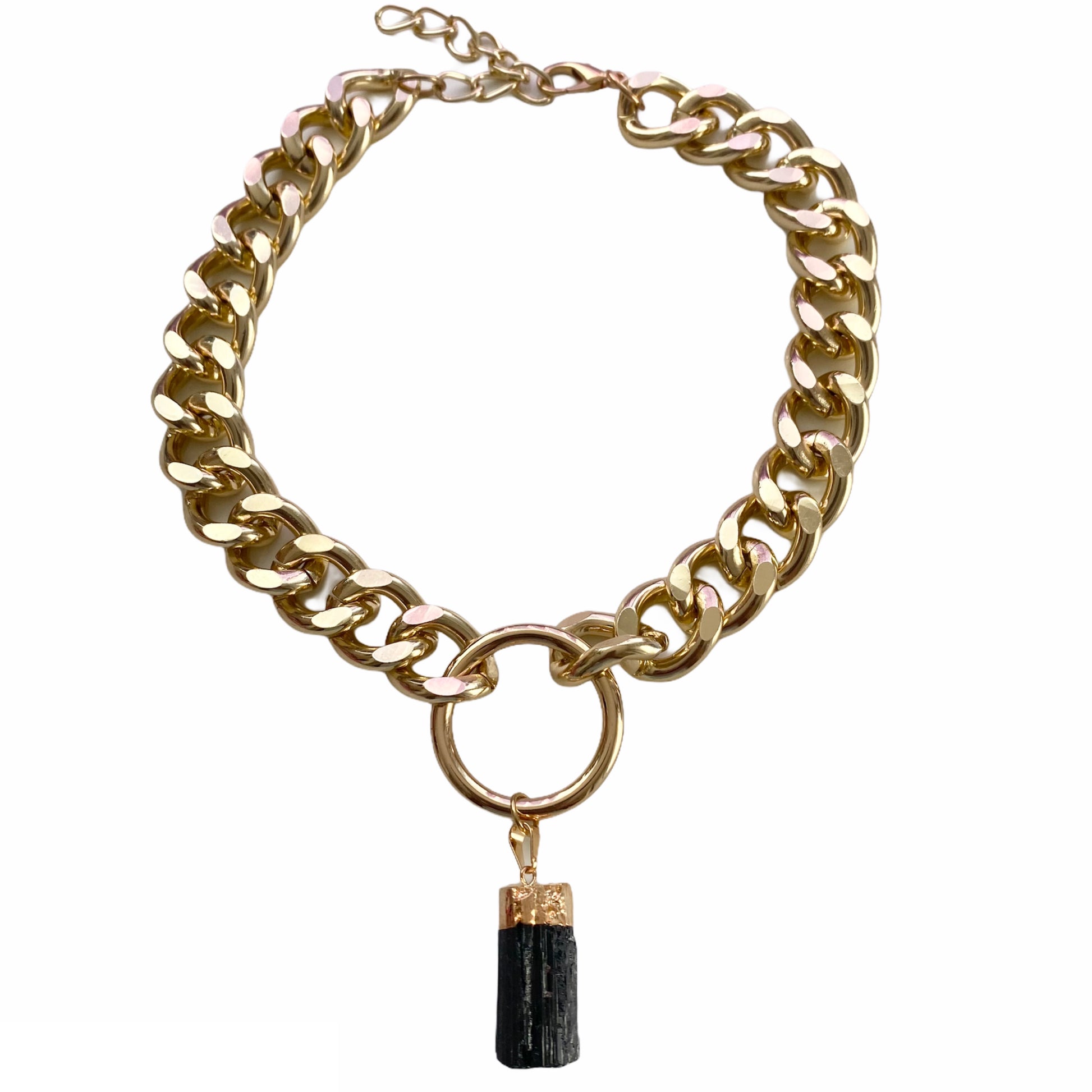 An eye catching, jaw dropping, gold plated statement necklace that packs maximum protection with its tourmaline pendant.