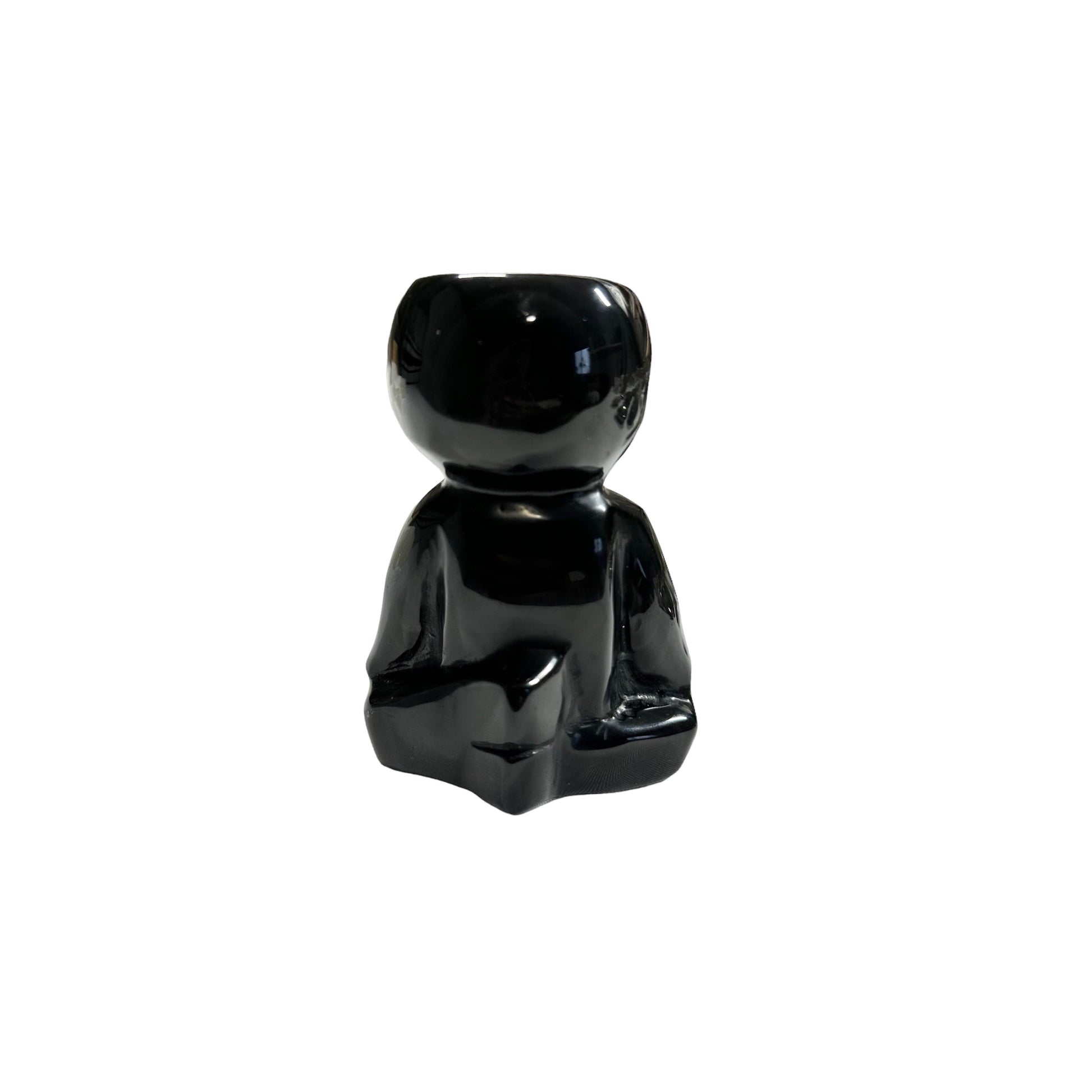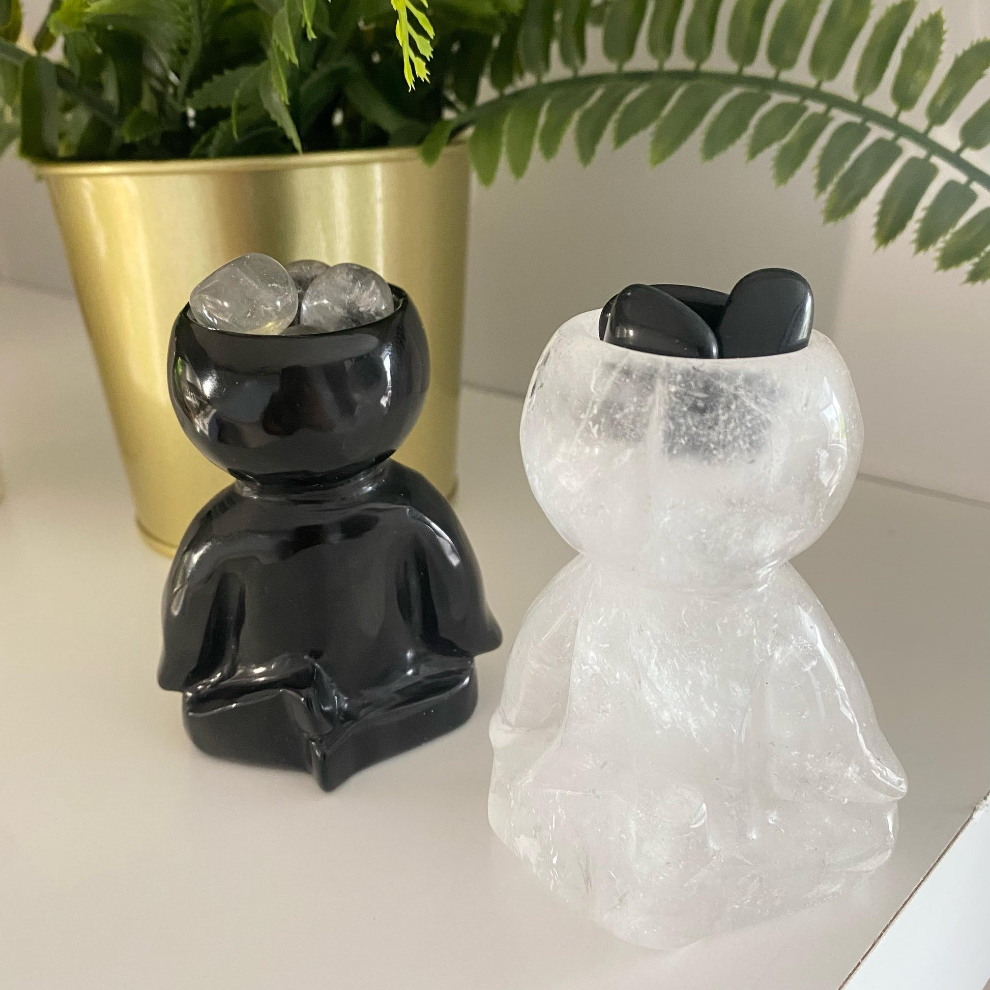 This one-of-a-kind Obsidian Meditating Cuphead is hand-crafted from black obsidian crystal, an ideal material for meditation practice and energy cleansing. Hand crafted with much attention to detail, this beautiful crystal carving can hold anything from tumbled stones to jewelry, providing the perfect balance of energy, peace, and beauty.