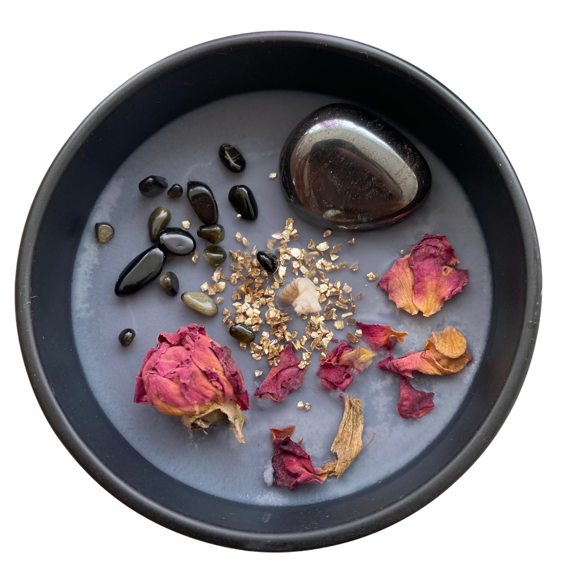 This beautiful candle embodies top notes of sandalwood and the bottom notes of roses. It's topped with Black Obsidian gemstone chips, rose petals and a Hematite Tumbled stone to representing strength and beauty.