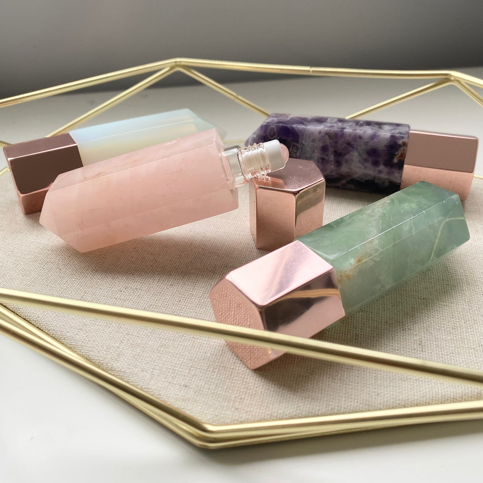 Add your perfume or essential oil blend to our gorgeous, gemstone point roller bottles. Perfectly sized to fit in your bag or purse, it a stunning way to carry your favourite fragrances everywhere you go!