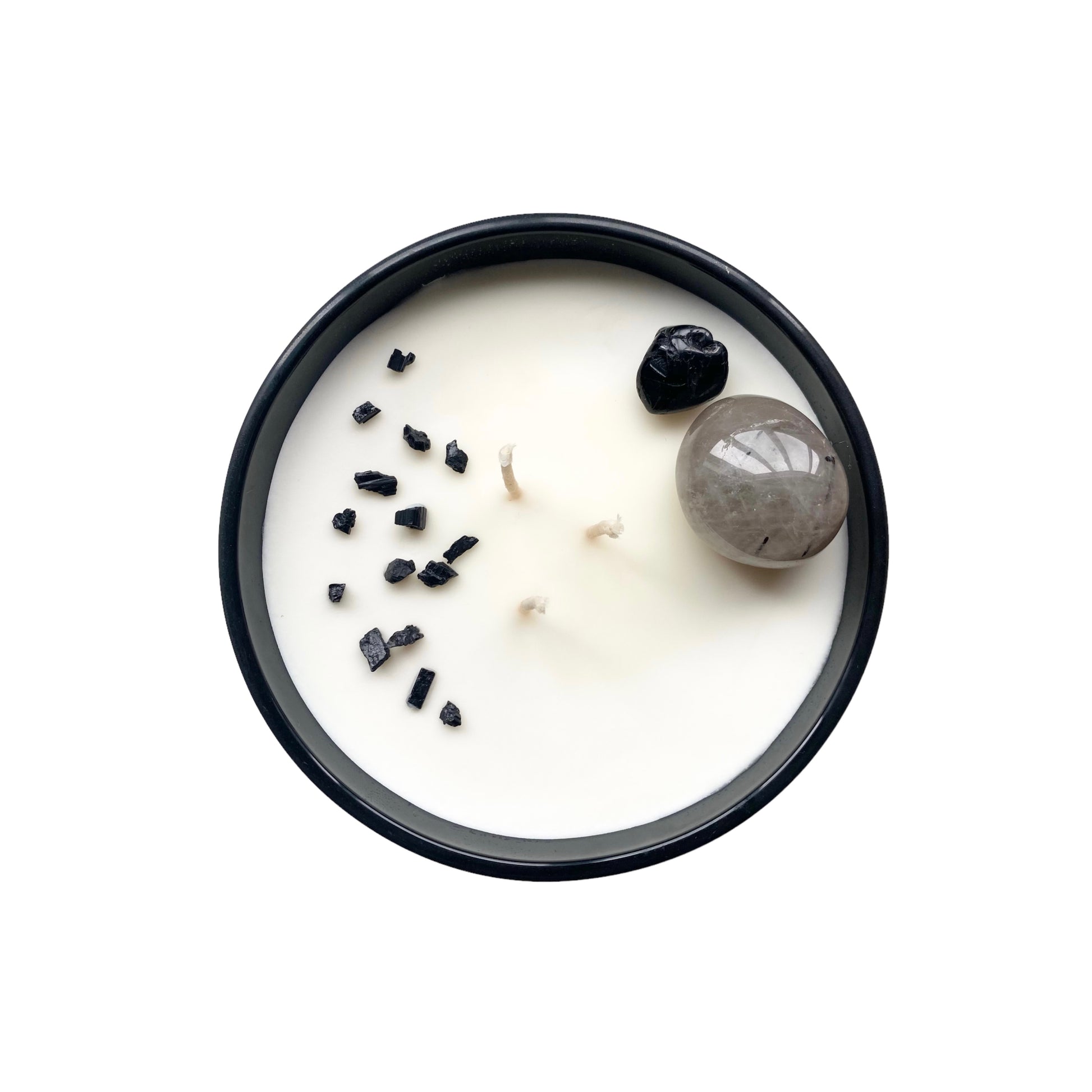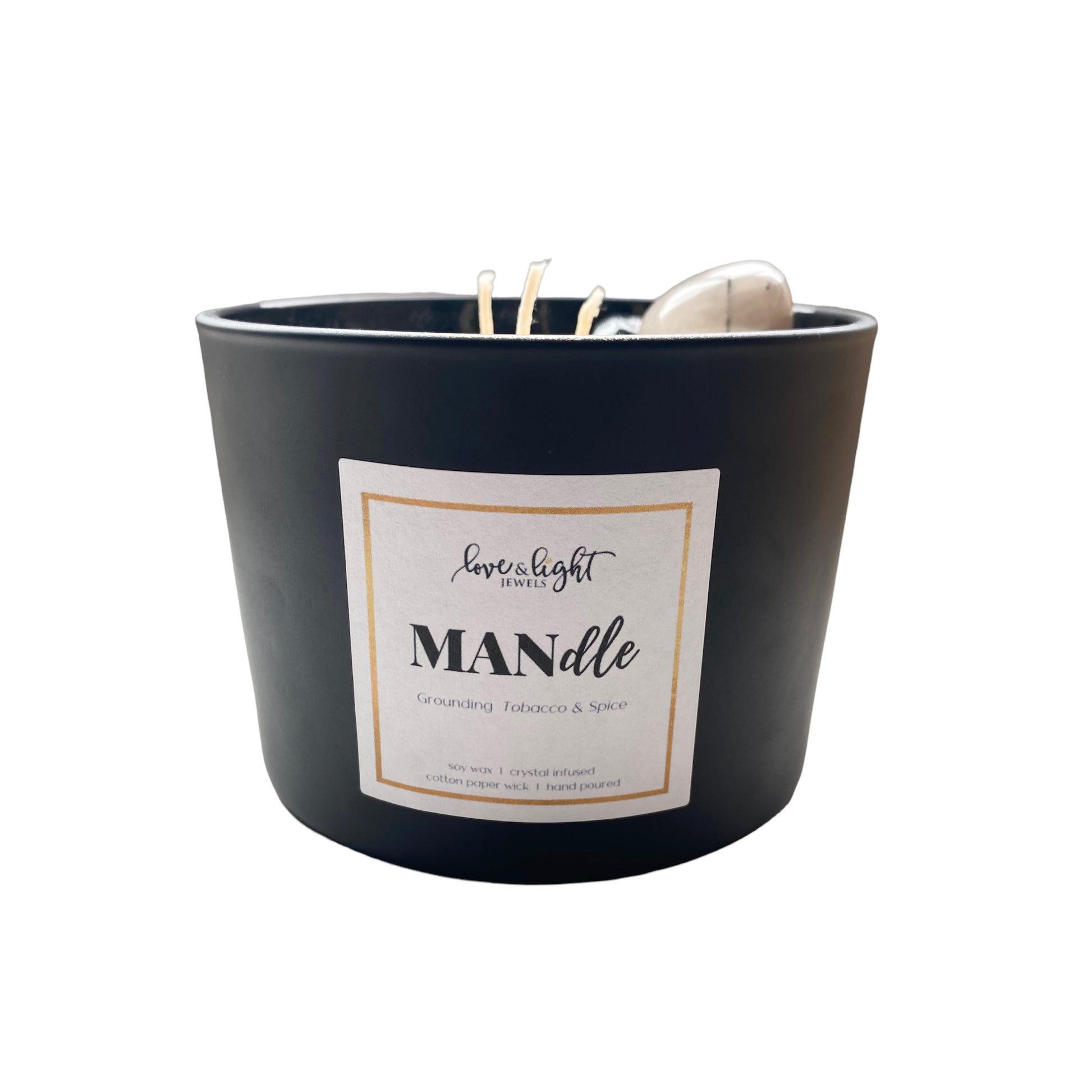 The MANdle is one of LLJ's largest candles made beautifully with a three wicks. It's accented with a large tourmalinated quartz tumble a small black tourmaline tumble and black tourmaline chips.