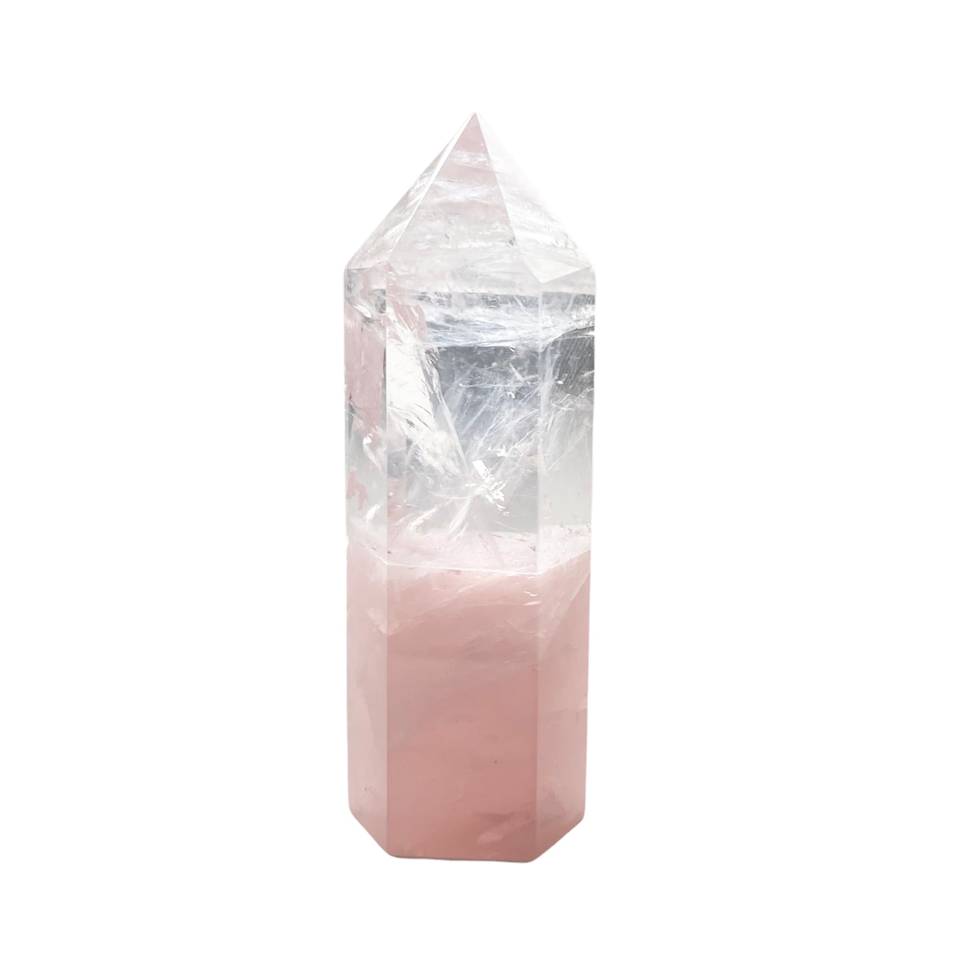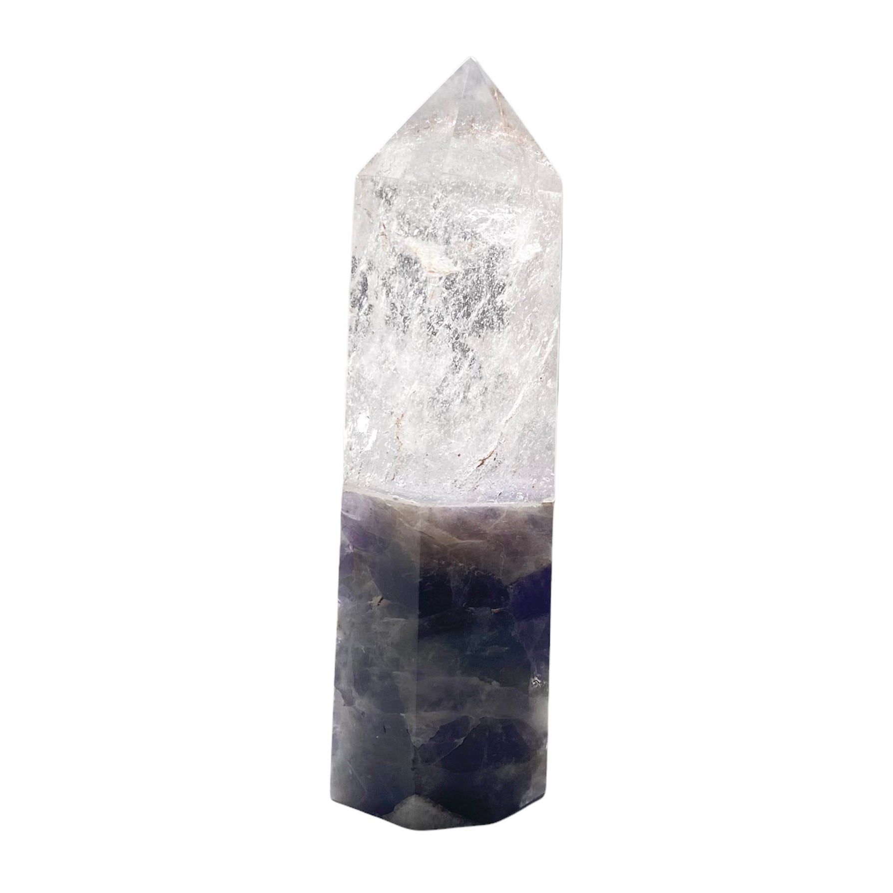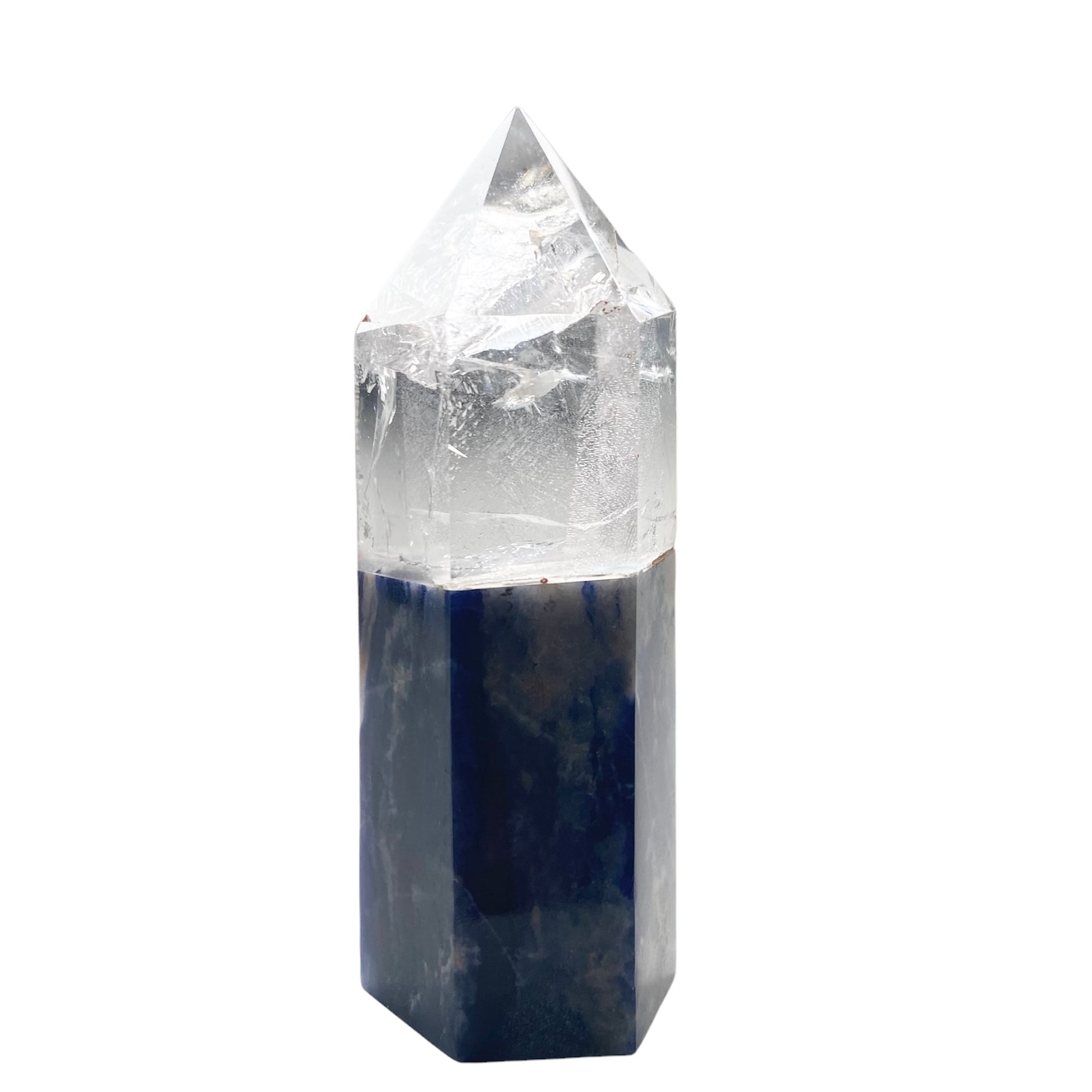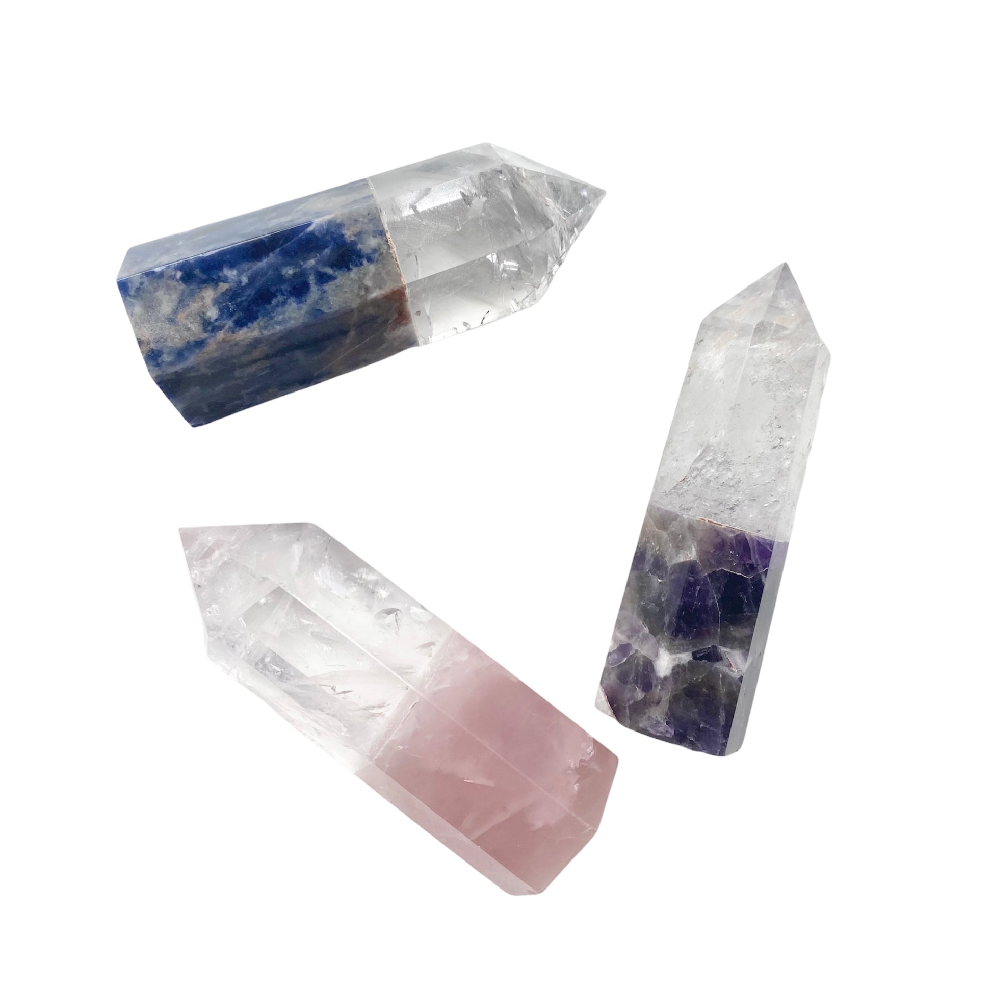 These unique crystal points are spliced with Clear Quartz, which is great for amplifying energy. Available in Rose Quartz, Sodalite and Amethyst.