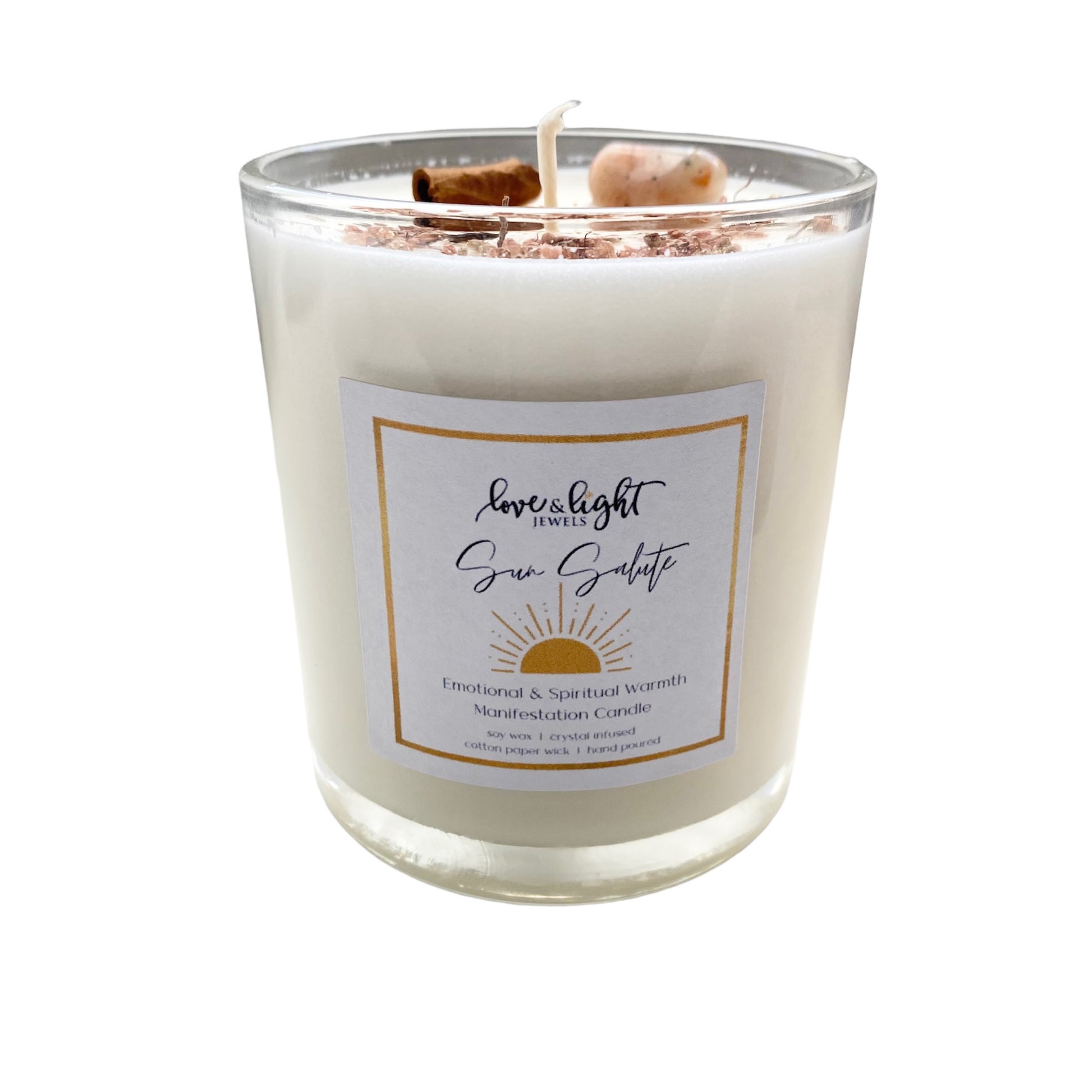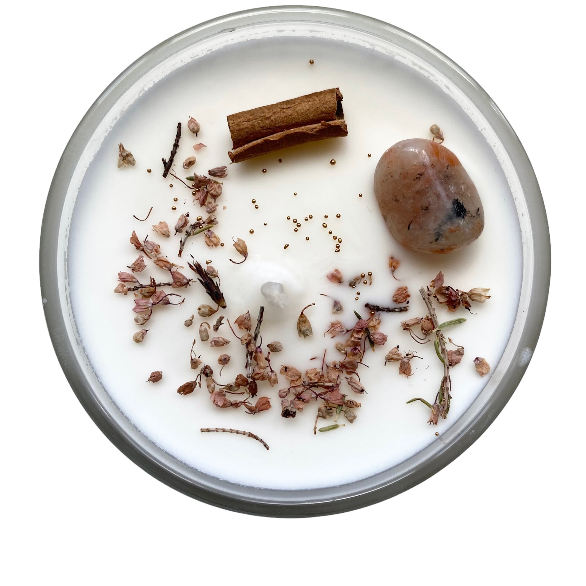 Created as an ode to yoga, this candle is a tribute to the beautiful sun salutation. Sprinkled with tiny pink flower blossoms and a sunstone tumble, this candle will instantly become one of your LLJ favourites. The fragrance is a combination of vanilla and cinnamon notes, which will leave you surrounded by warmth just like the sun!
